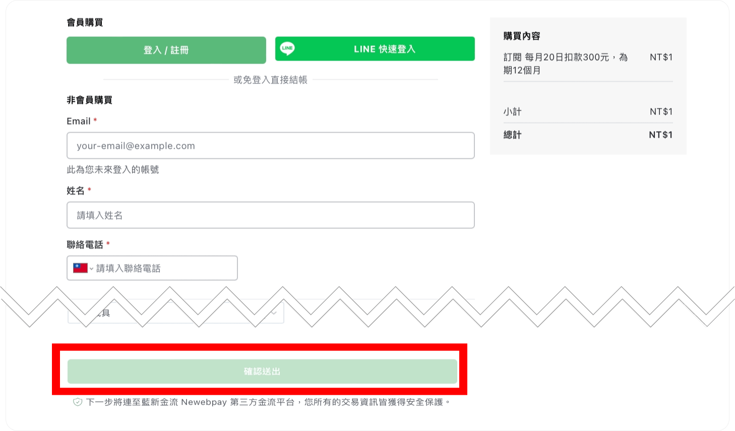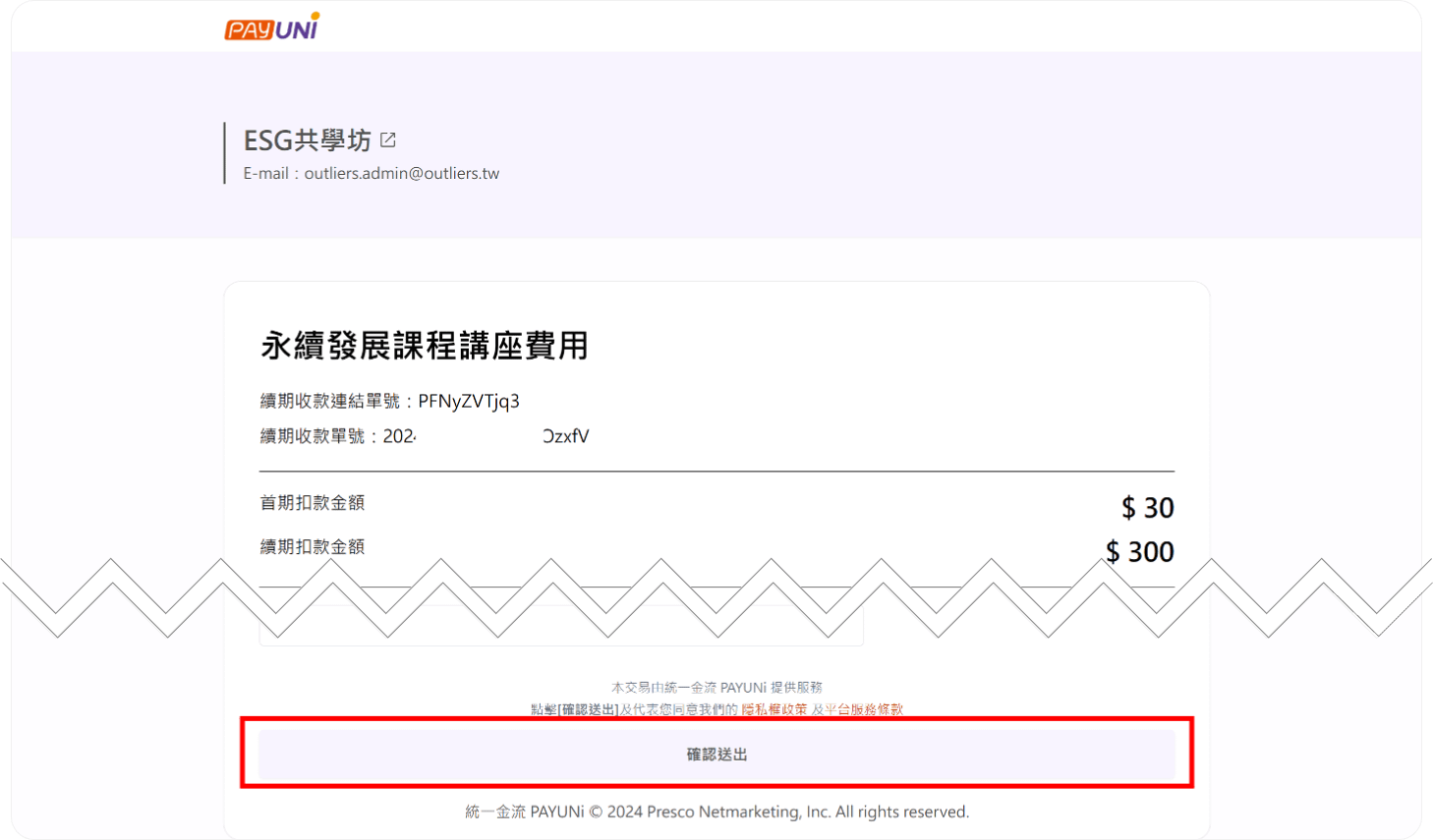 按下「確認送出」後,我們會先以您填寫的信用卡進行30元驗證扣款,該金額將在5個工作日內退還,您會收到一封刷卡通知信,以確認扣款成功。